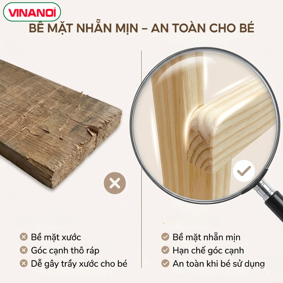 Bề mặt gỗ nhẵn mịn, hạn chế góc cạnh, giúp giảm nguy cơ trầy xước khi bé vui chơi và tập đi.