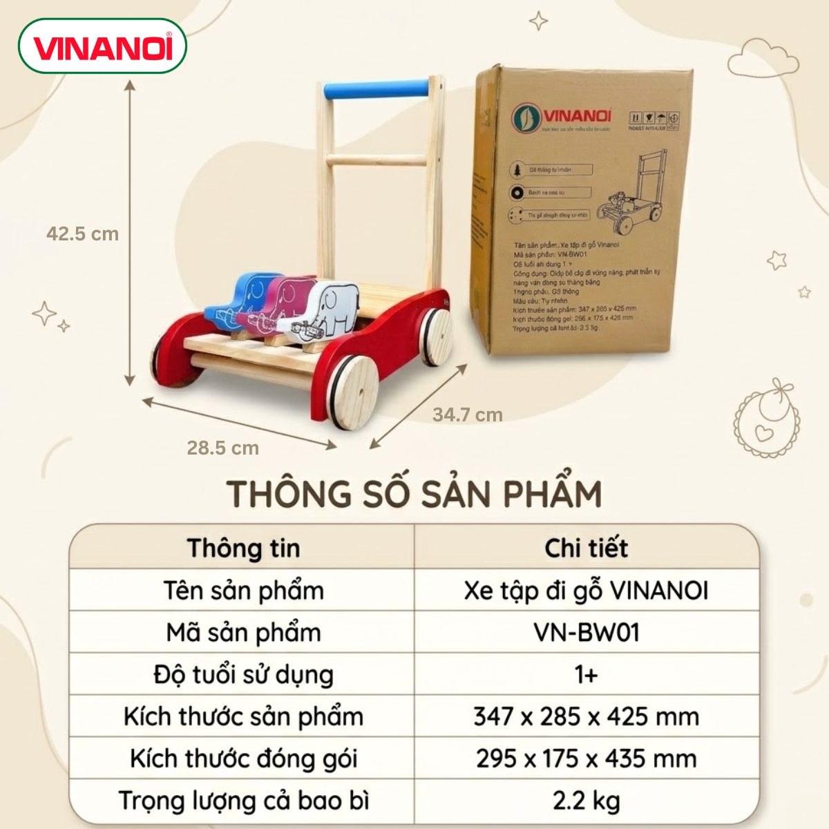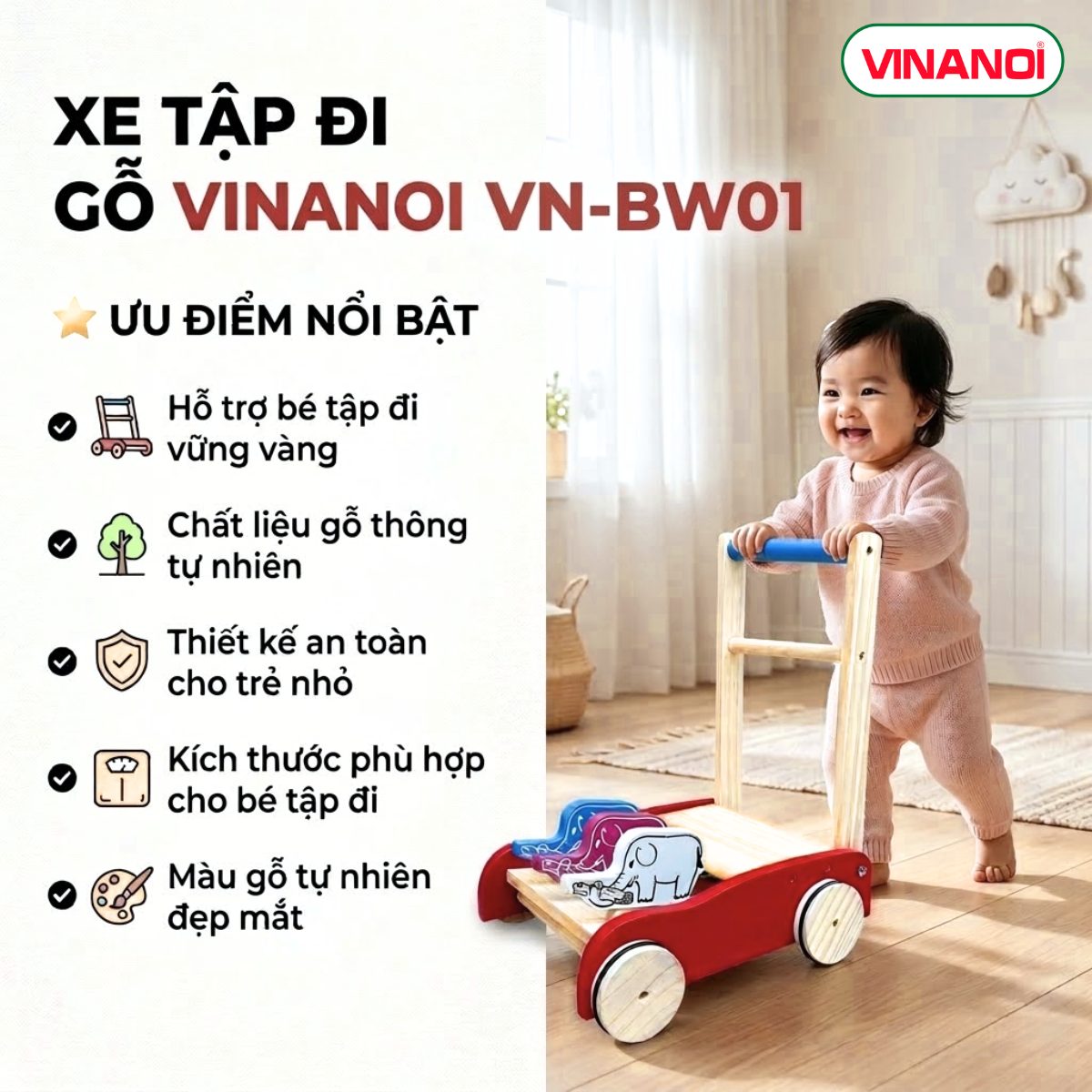Xe Tập Đi Gỗ VINANOI VN-BW01 – Hỗ Trợ Bé Tập Đi Vững Vàng Từ Những Bước Đầu